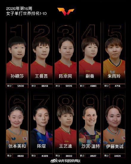 - 国际乒联2026年第15周世界排名:孙颖莎、王楚钦位列第一