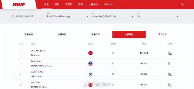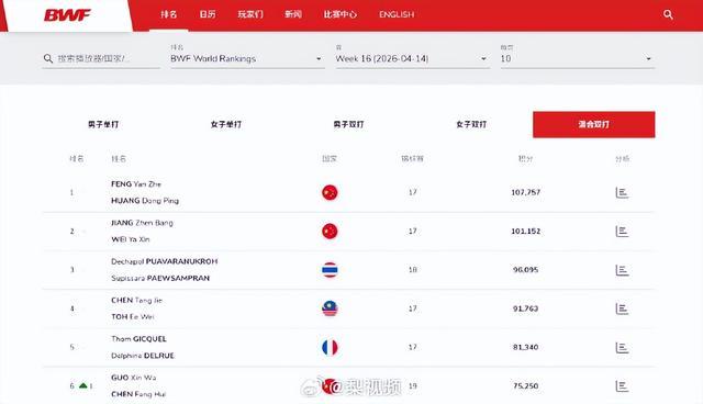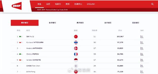 世界羽联最新排名出炉:石宇奇重返世界第一 世界羽联公布了2026年第16周世界排名。中国羽毛球队在五个单项中斩获三项世界第一,其中男单石宇奇以105,967分重回世界第一宝座,成为本周最大亮点。男单:石宇奇强势登顶,李诗沣位列第七男单赛场迎来重磅变动。石 ... 世界排行04-17