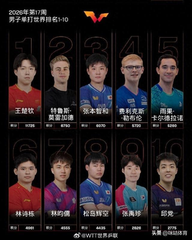 最新世界排名,王楚钦11725分第一,林诗栋第5,张本智和第3 北京时间4月21日消息,国际乒联2026年第17周世界排名火热出炉,男子单打方面,中国队在前十中有王楚钦林诗栋两人,其中,王楚钦继续高居世界第一,林诗栋排在第六。另外,男乒最主要对手日本选手张本智和排在世界第 ... 世界排行04-21