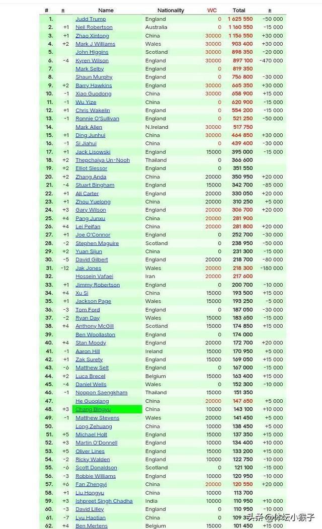 张安达从资格赛打起,连胜两轮进入正赛,虽然首轮出局,但积分仍让他排名上升两位,来到第20。 19岁的穆迪即使首轮落败,也因为其他球员的扣分,排名攀升四位,创造个人新高。