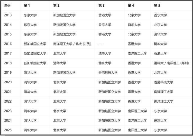泰晤士亚洲大学前五名历年排名一览: