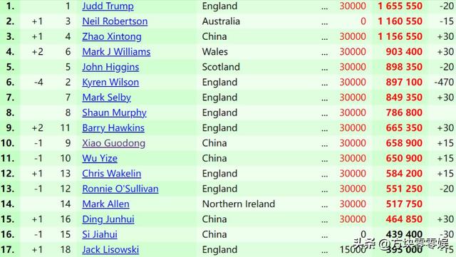 丁俊晖升到了第15,斯佳辉掉到了第16。