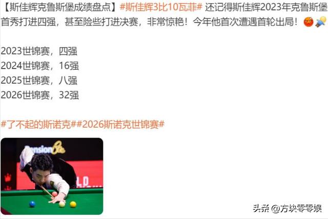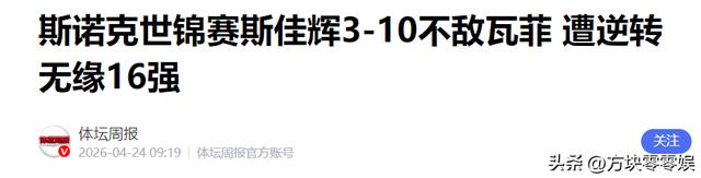 体坛周报——斯诺克世锦赛斯佳辉3-10不敌瓦菲 遭逆转无缘16强