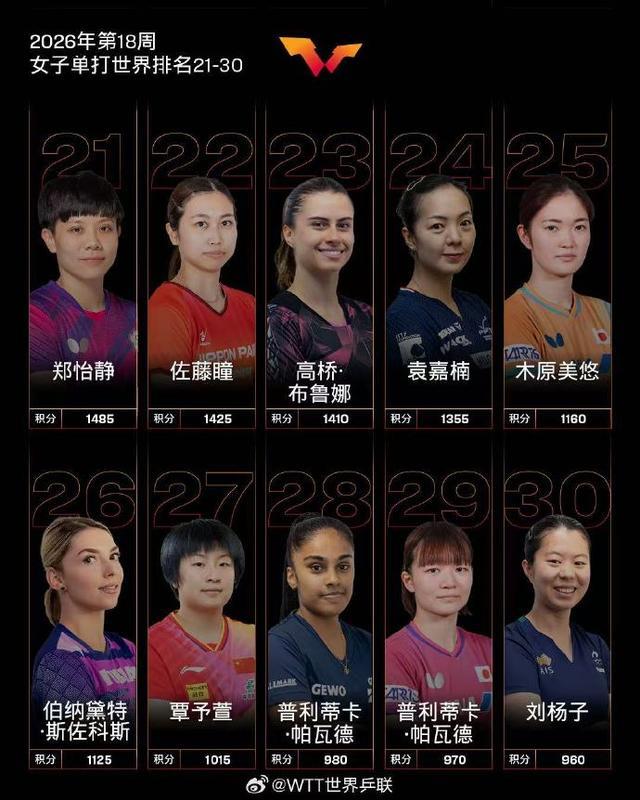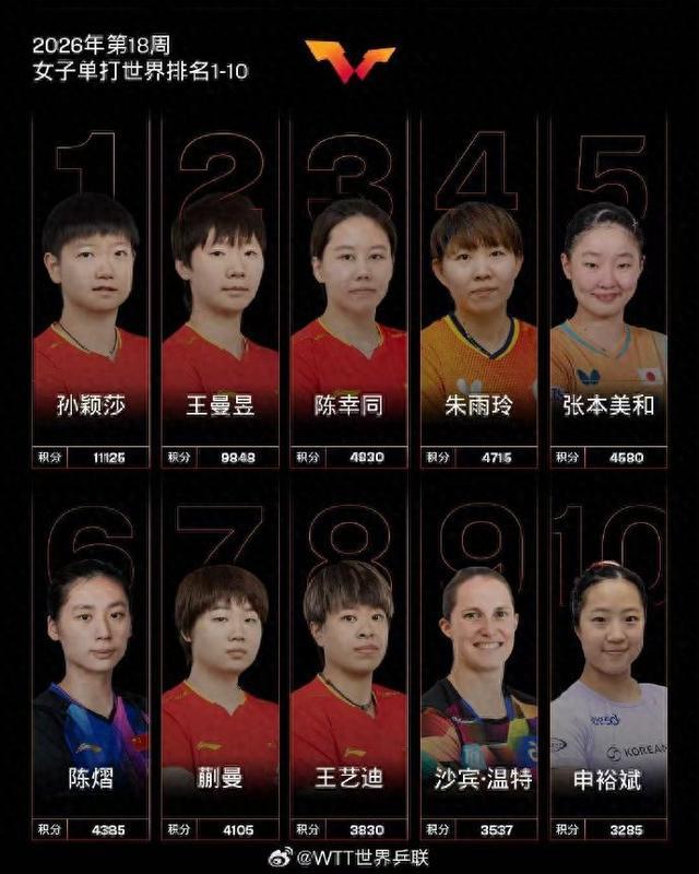 - 最新世界排名:孙颖莎第一、王曼昱第2,女乒包前4,张本美和第6