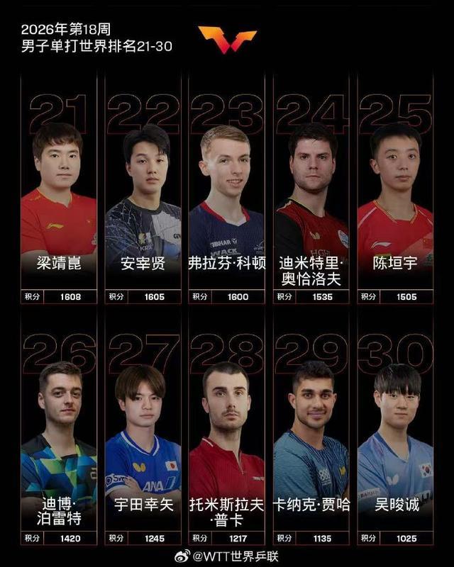 - 男单最新世界排名出炉:王楚钦稳居榜首!国乒小将稳步攀升