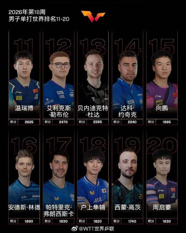- 最新世界排名:王楚钦第一,冠军温瑞博11,张本智和第4,石头第5