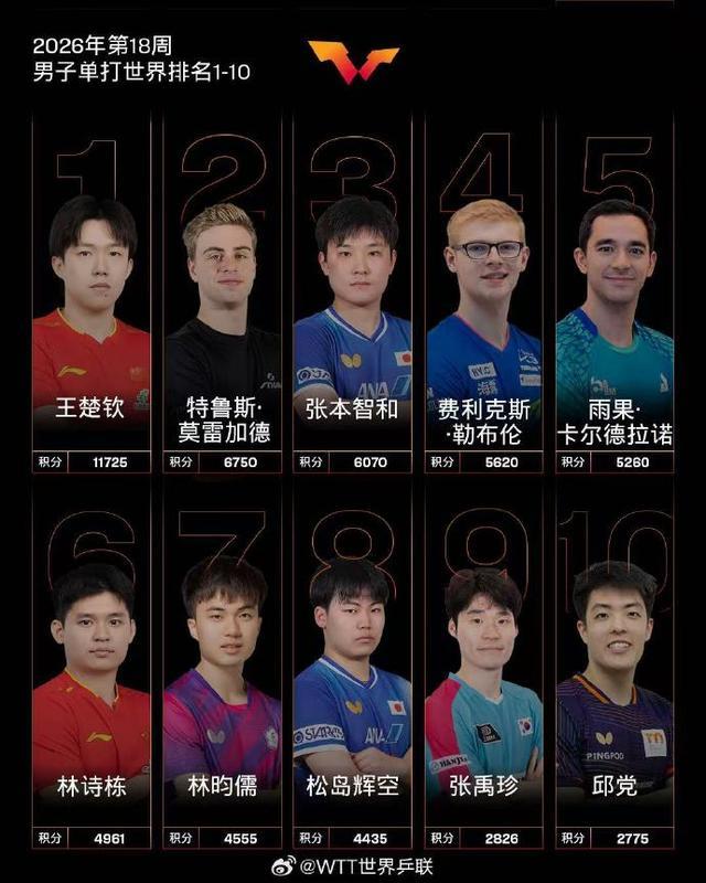 4月27日,国际乒联公布了2026年第18周世界排名。男子单打,中国队球员王楚钦以11725分位列榜首,林诗栋以4961分位列第六。女子单打,中国队球员孙颖莎、王曼昱、陈幸同位列前三。