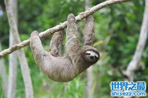 树懒外貌看起来有点吓人,而且它长着非常长的爪子,它那尖锐的爪子是专门用来爬树用的,但是它们不会伤害人类,非常的和蔼可亲,一般要是在马路上遇到它,可能要等很长一段时间它们才会爬到路的对面,它们是爬几步就会停一会儿,然后再接着爬,在世界上最慢的10种动物中排名第七。