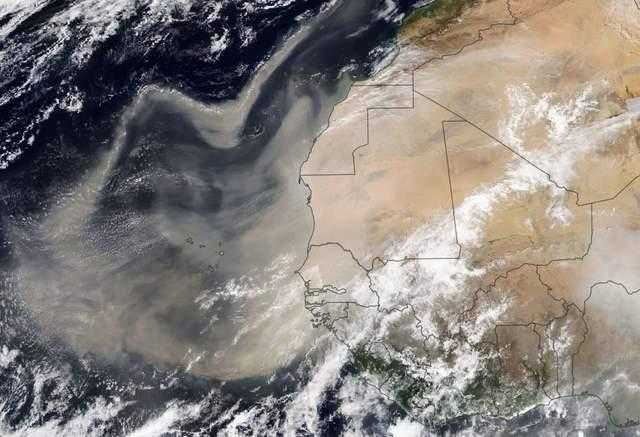 在大量的沙尘跟着风向西移动的时候,最终会进入到大西洋的海域里面,随着风力的降低过之后,这些沙尘也都会进入到海面之中,沉入到海底,对于整个海洋生态系统来说,也能够提供一些营养物质。随着风还能到达许多地方,甚至飘飘扬过海之后,来到南美洲,给亚马逊的平原之中的热带雨林都能够带来肥力,甚至有很多沙尘,还能够跨越地中海,落到阿尔卑斯的冰川积雪上,影响到积雪的融化。