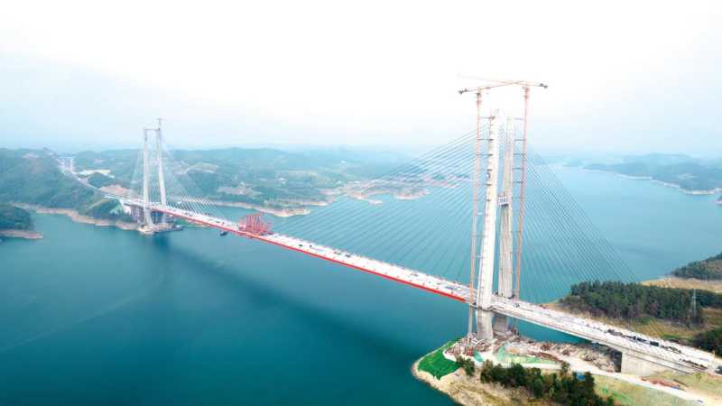 标段之内的丹江口水库特大桥是全线的一个重点控制性的工程,主跨了760米是作为跨越国家南水北调中线工程水源地,国家一级水源保护地的一个重点高速公路,被称之为世界上最大跨经大桥。