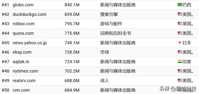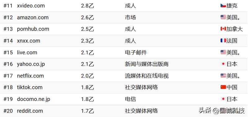 俄罗斯、中国、日本和韩国位列前五。中国一共上榜四个个顶级网站:百度(#6)、QQ(#38)、哔哩哔哩(#34)、TikTok(#18)。