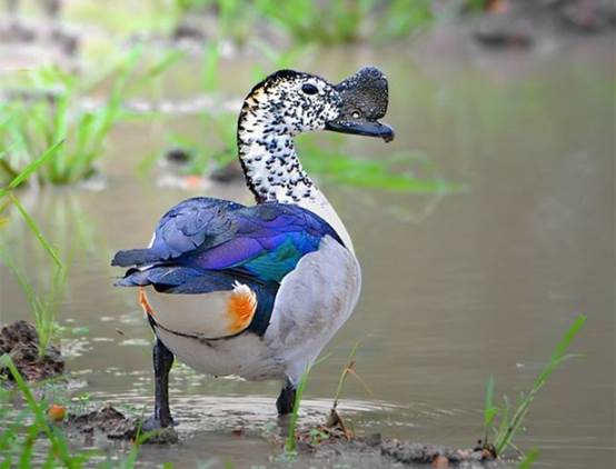也被叫做梳头鸭,非常的独特在雄性的喙上面有一个黑色的圆头,是属于最大的水禽物种之一。在成年过之后,白色的头部上面则是会生长出黑色的斑点,是在撒哈拉以南非洲马达加斯加和南亚的湿热地带所发现的,头部的颜色呈现出较为有光泽的蓝黑色,雌性的体型比雄性要小一些,主要生活在淡水,湖泊,河流,沼泽,稻田之中,在身上还有着蓝绿色的彩虹色。