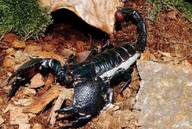 这种蝎子是属于一种大型的蝎子,一般体长能够长到17厘米左右。在目前为止最大的记录则是长到了30多厘米左右,整体的长相是黑色的甲壳,又黑又硬,在表面则布满了各种粗糙凹凸不平的圆点,成熟之后基本上三年左右才能够繁衍。主要分布在非洲的热带雨林,还有一些沙漠之中也能见到。目前野外帝王蝎的组群则面临着危险,已经被列入保护动物之中。