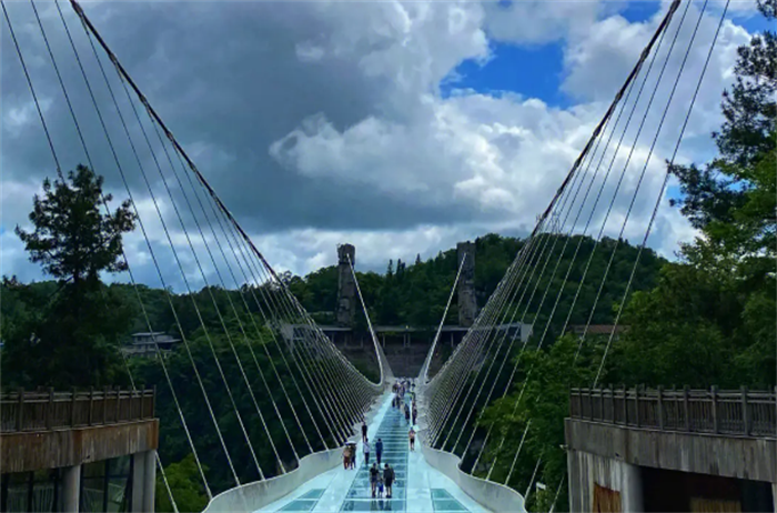 是桥就可以走路,玻璃桥也是如此,不仅可以走路功能特别多,是因为上面的玻璃板质量特别好,采用了三层钢化玻璃,每一层的中间有胶片固定,主纵梁和横梁上边铺设了两层钢化防滑玻璃,毕竟玻璃的面是相当光滑的,一旦遇到下雪天或者下雨天很有可能会出现事故,因此采用的这种设计。玻璃结构下方和侧面设置属于弹性橡胶垫片,确保安全的情况下有足够的间隙和变形协调能力。