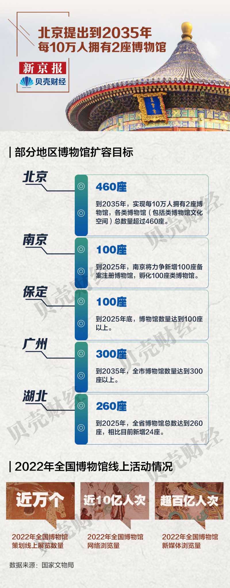北京已经形成全国规模最大、影响最强的城市博物馆体系,但在人均博物馆拥有量上仍有提升空间。今年2月《北京博物馆之城建设发展规划(2023-2035)》(征求意见稿)正式发布,提出到2035年,北京博物馆总数量超过460 座,实现每10万人拥有2座博物馆。此外,南京提出,到2025年,力争新增100座备案注册博物馆,孵化100座类博物馆。