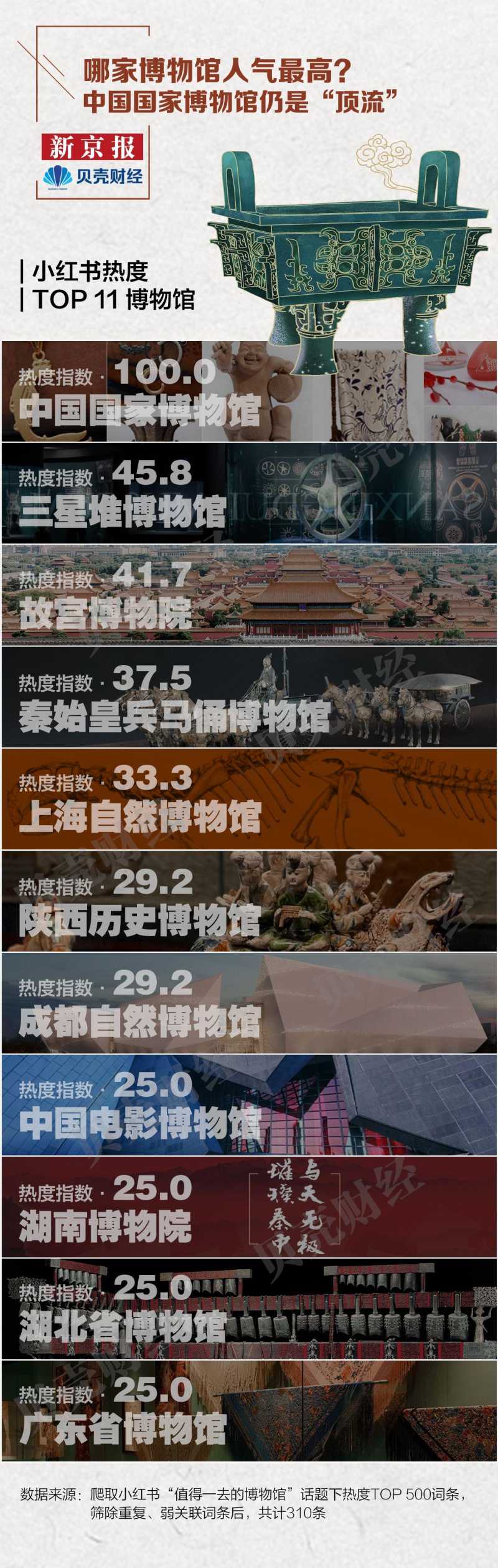 贝壳财经记者爬取小红书“值得一去的博物馆”话题下热度TOP 500的词条,除去重复、弱关联词条,分析共计310条有效词条发现,国家博物馆成为多数网友推荐热门地,近些年,不断有新考古成果的三星堆博物馆也成为网红打卡地,故宫博物院则排在第三。