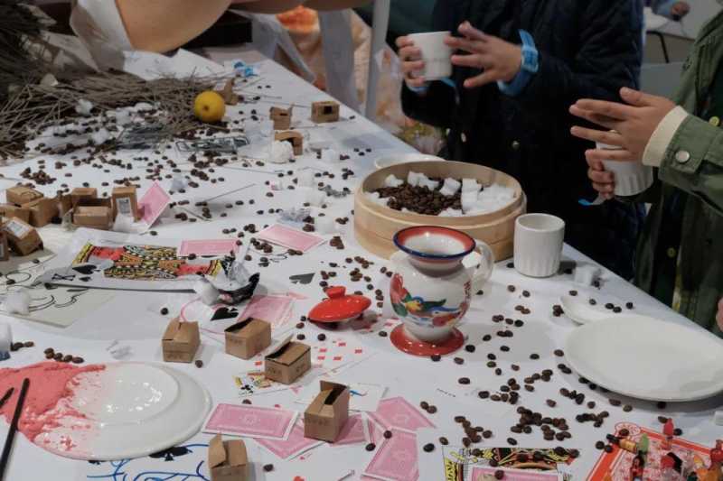其中有一个互动装置是一张铺着白布摆满各种道具的桌子,好多小朋友就坐在那里捏橡皮泥画画做手工,我逛了一小时回来桌子已经大变样。