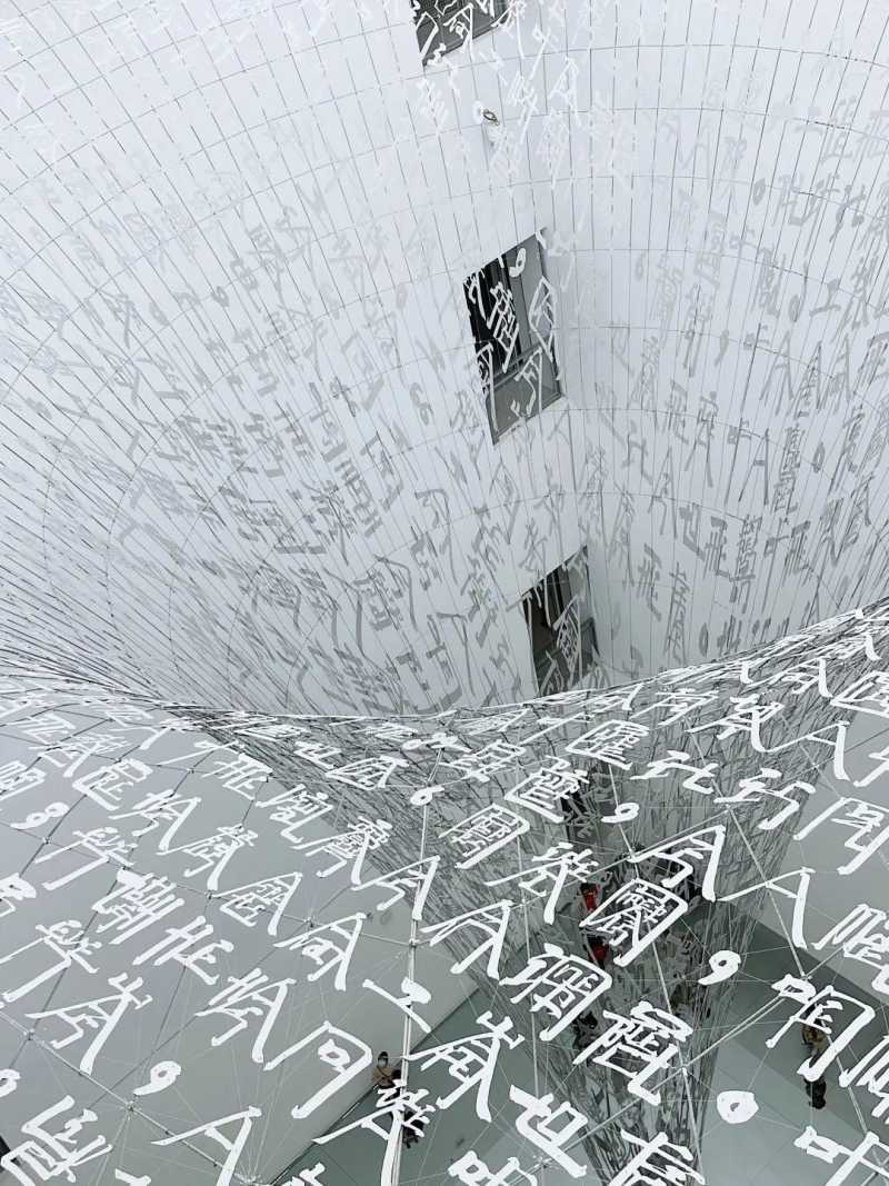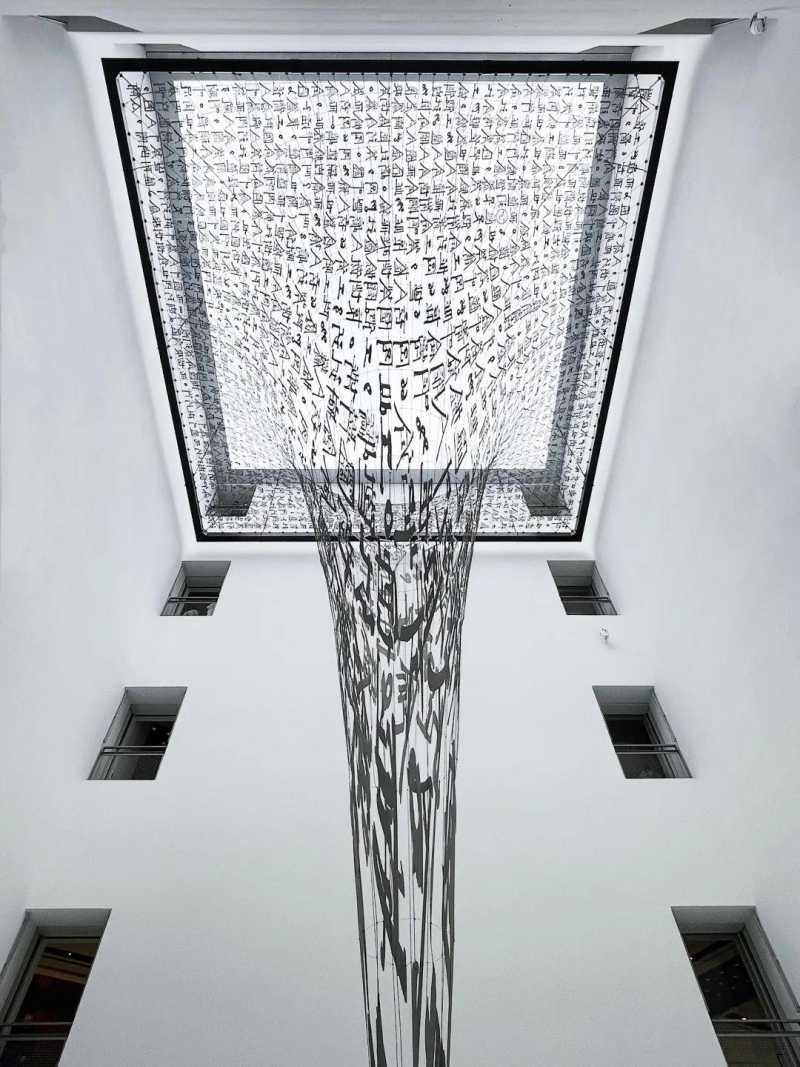 也有艺术家徐冰的巨型装置作品,是为浦东美术馆量身定制的。它由1600个金属材质的“英文方块字”组成,在不同角度观看到的装置画面都不一样!