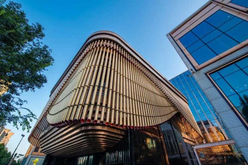 复兴艺术中心的建筑辨识度很高,外圈的三层幕帘由675根铝合金组成,在固定时间下会配合音乐转动,宛如竖琴一般。