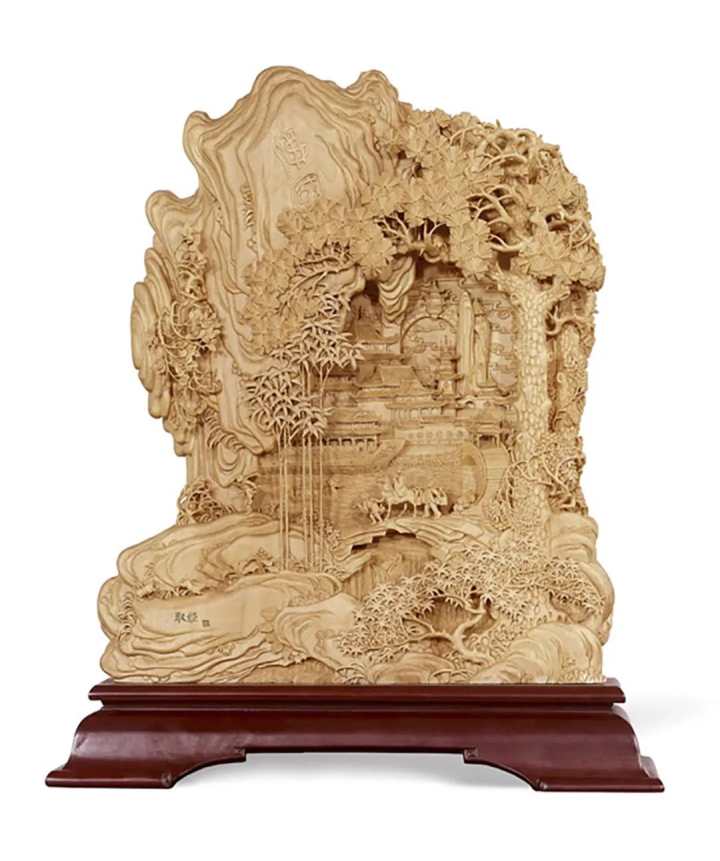 陆光正:一九八〇年东阳木雕总厂接下了新加坡一家酒店的木雕装饰工程,我组织了十几位同行设计制作了十二块长十二米,宽一点二米的挂屏,被时任新加坡总理李光耀誉为新加坡至今最好的建筑木雕装饰,使东阳木雕再度轰动了海外。但不久,由于气候等问题许多大件作品发生了开裂,东阳木雕的声誉面临挑战。因为之前东阳木雕受到了极高的关注,所以开裂的问题一出现立即在业内掀起轩然大波,认为大型作品木雕不能做,木雕做不了壁画,木雕有短板等等,各种质疑不绝于耳。我当时压力巨大,就下决心一定要解决这个困扰东阳木雕千百年的问题。有一次我看到工人们将一座屏风折叠起来准备装箱,这给我极大的启发。过去的东阳木雕都是在一块板上雕刻,我就尝试化整为零最后再组装,经过多年无数次的实验,终于找到了解决的途径,将图像根据构图分成若干个单元,每个单元采用独立的板材,板块之间留有空隙防止热胀冷缩。我把这项新工艺称之为多层叠雕。这种工艺不是简单的图案堆积叠加,既要考虑画面的布局又要考虑牢固程度。二〇〇一年杭州市要重建雷峰塔,我用多层叠雕技术做了六面大型壁挂,十几年过去了依然完好如初,没有出现一道裂痕,此后又在杭州楼外楼、人民大会堂、中国财税博物馆等地方创作了很多大型木雕作品,东阳木雕再也不是“雕虫小技”了。
