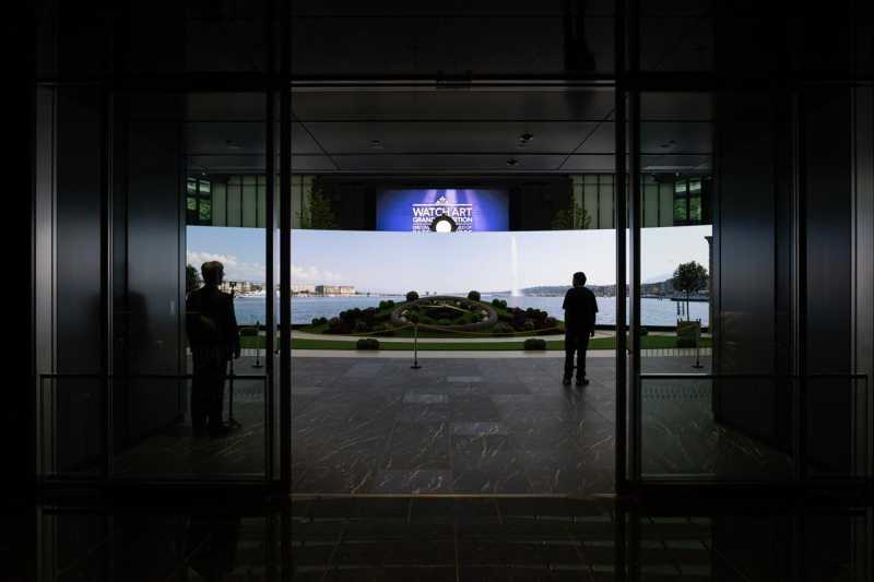值得提到的是,住友大厦三角广场是一座采用无柱空间设计、由玻璃包裹的密闭建筑,其玻璃屋顶最高点达到25米。百达翡丽凭借其独特的建筑特点,充分利用自然采光和影像技术,在展览入口处再现了日内瓦著名景点“花钟”(Flower Clock)以及日内瓦湖的迷人风光。