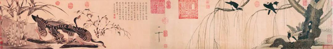 宋徽宗不仅擅长画花鸟,还能画别的,他的画路非常宽广,人物、山水、墨竹等杂画都有涉及,比如宋徽宗的《听琴图》就是他的人物画代表作。这幅画是一幅上下很长的长卷,宋徽宗背后的松树被画得很高,画面的顶端还有蔡京的题诗;还有赵佶以及宫廷画家共同创作的绢本设色画 《文会图》也是宋徽宗人物画的代表作之一。
