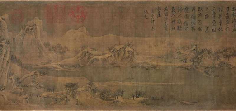 而宋徽宗山水画的代表作当首推《雪江归棹图》,画幅的右上角有赵佶瘦金书“雪江归棹图”,左下角钤“宣和殿制”印并“天下一人”花押,卷后有宋蔡京,明王世贞、王世懋、董其昌、朱煜五家题记。此画气势很雄浑,格调很苍茫,不同于宋徽宗花鸟画格调很清雅的风格,而更多表现出一种很雄浑,很悲凉的画风,体现了宋徽宗画风的开阔和多样。