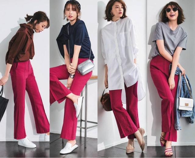 比如,红色裤子。型利落、色妩媚,型+色混搭,生出最优的美感,至于裤型,不限。九分裤干练,阔腿裤飘逸。