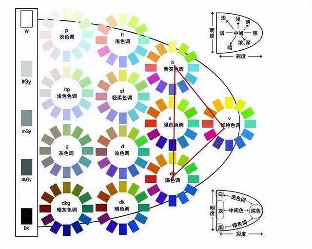 如果在色调图中取色,可在明亮色调、强烈色调、鲜艳色调、深色调中选用(红三角部分)。