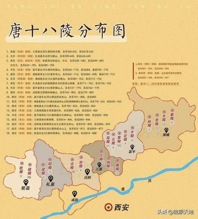 地处陕西关中的帝陵是唐朝 19 位皇帝的 18 座帝王陵寝及陪葬墓室,因武则天与唐高宗合葬于乾陵,19 位帝王只有 18 座陵墓。其中咸阳市9座(礼泉县2座、乾县2座、泾阳县2座、三原县3座),渭南市9座(富平县5座、蒲城县4座)。