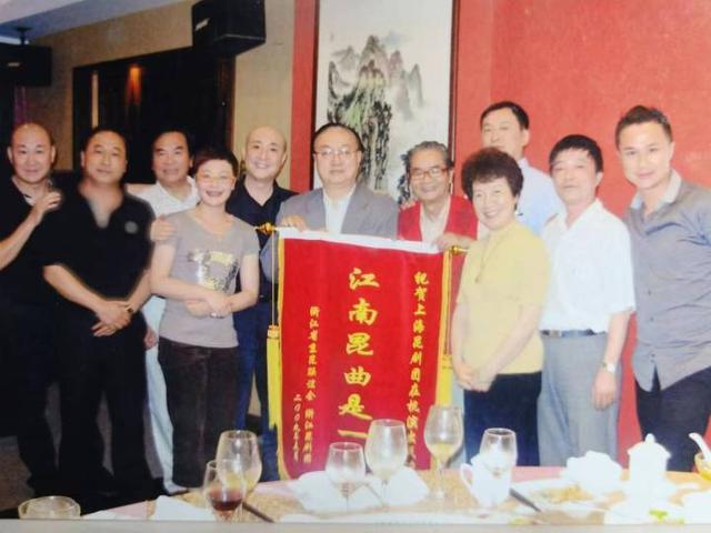 虽然有这么多名头在身,但这位艺术家始终是才华横溢、情商高尚、平易近人。2009年上海昆剧团来到杭州巡回演出,我在杭州楼外楼特安排了接风晚宴,上昆来杭州演出被邀请参加的有蔡正仁、张静娴、谷好好、史建、郭宇、张军,浙江省的有沈祖安、林为林、程卫兵、孙丽娟和我,宴会后我们赠给上海昆剧团一幅大红锦旗,上面绣着“江南昆曲是一家”,祝贺上海昆剧团在杭演出成功!在赠送大红绵旗时合影,这珍贵的照相和回忆显示了沪浙两地昆曲界的友谊,这也是我第一次见到谷好好。