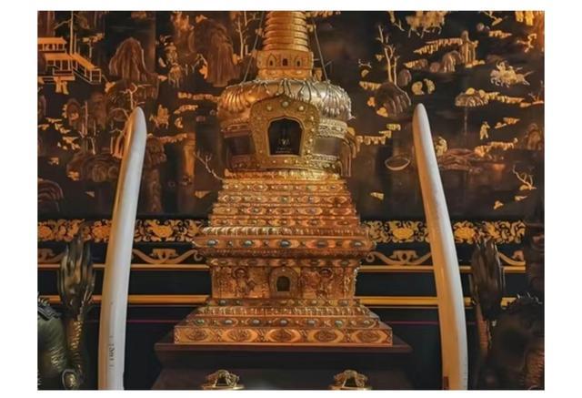 高约2米,通体鎏金,镶嵌绿松石、珊瑚,现藏枫丹白露宫。工艺、体量、奢华度,都是清代佛塔艺术之最。