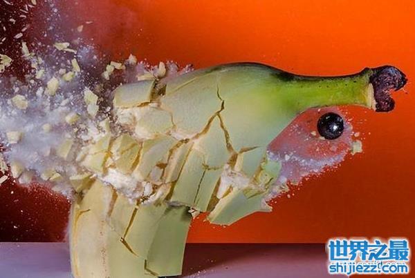 16、被液态氮冻住的香蕉,受到小球的轻轻一击。