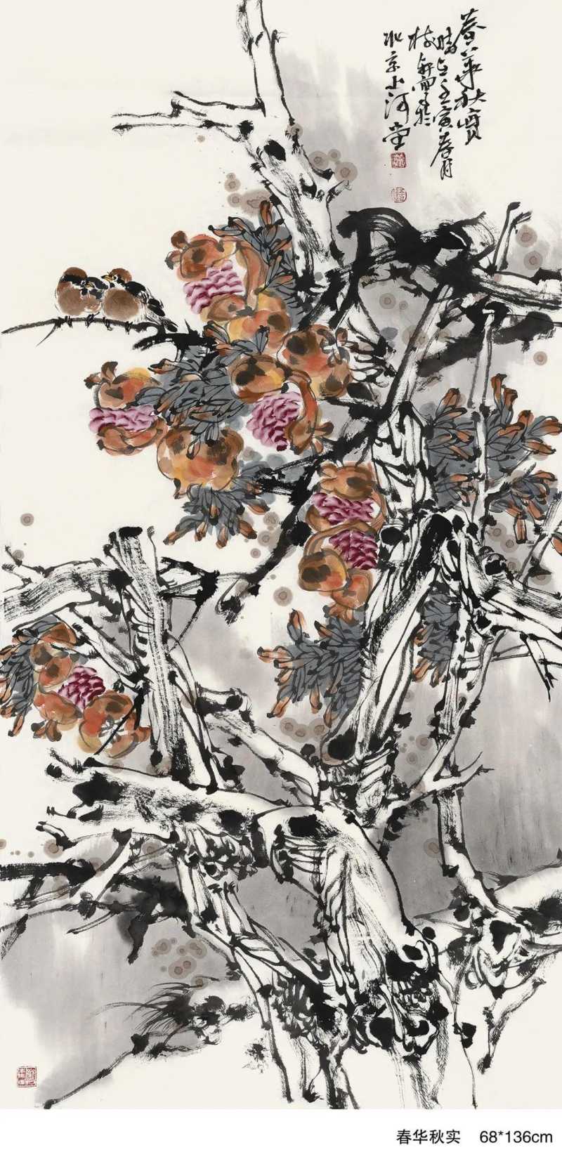 在众多花鸟画题材中,崔树轩选择了自己最熟悉、最有感触的石榴作为研究对象,研读古今中外大量石榴画作品,取百家之长,他的画的优点在于得势灵动,在布势之时奇中有正、虚中有实、平中有险,而画面的留白和点线面所形成的笔墨旋律与节奏构成了他特有的画面气势与气息。