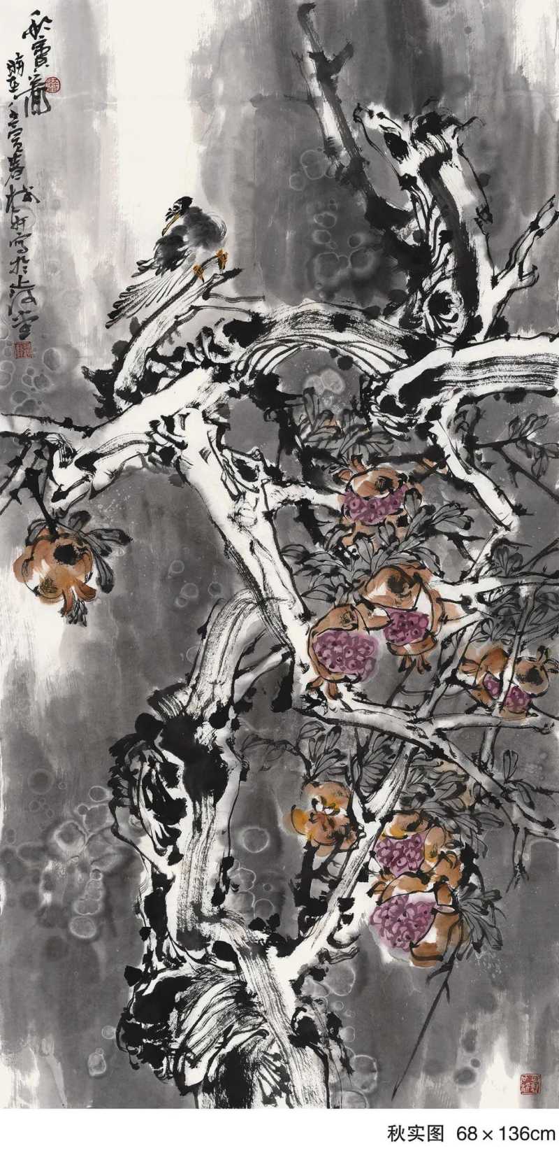 观其作品,枝干苍劲雄厚,枝叶疏密有致,笔下的石榴,果实红艳饱满,色泽清晰明快。且注重细节的把握,裂开口的石榴果生动鲜活,石榴籽和石榴膜使人垂涎三尺。其行笔劲逸潇洒,既果断而强悍,静练而有控制,雄健、刚直、凝练、老辣是其追求的艺术格调,看似写实、随意,实则完全脱离了形的束缚。他深入体会和吸收了古人的笔墨精华,又融入强烈个性,尤其是在气势和力量方面创造性地发展了笔墨传统。