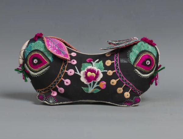 由于兔被赋予多种祥瑞之义,其本身也具有灵巧敏捷等特质,在民间,女子还常缝制以兔为形的衣饰物品,如兔儿枕、兔儿鞋、兔形香包、兔形布玩具、兔形挂饰等,一针一线中寄托了对生命的呵护与期许。兔形枕早在唐代就已出现,三彩釉陶烧制,形制多为写实的卧兔。而陕西蒲城的一件黑兔孩枕,则被民间艺人以夸张的手法设计成双头并体的对称造型,黑色底布上以粉、绿、黄等彩线绣出花卉、铜铃等纹饰,尤其突出了眼睛部位的装饰效果,整体的色彩搭配充满浓厚的民间审美趣味。在北方一些地区还有制作兔儿鞋的习俗,鞋前端似兔子头,绣鼻唇、红眼睛,鞋口两侧缀附兔耳造型,口沿后端则缀绣带以象征兔尾。中秋节给儿童穿兔儿鞋,其意义不言而喻,希冀幼儿如小兔般腿脚利落行动灵活。