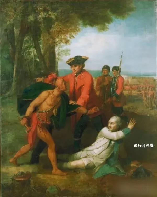 下面第一幅画《约翰逊将军从北美Tomahawk部落的印第安人手中解救一位受伤的法国军官》涉及到美国的独立战争,这里面牵扯到美国建国历史,我这里就不讲了。