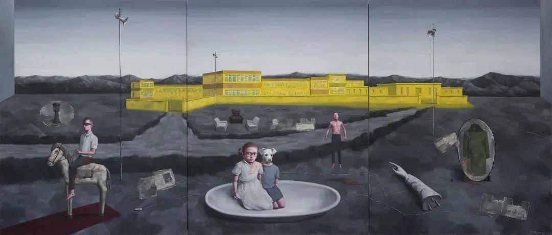展览另一重心是布面油画“舞台”系列和“光”系列,与纸上作品形成尺幅对比和内容呼应。《舞台:城堡3号》接续和发展了2008年前后张晓刚以非现实风景为主体的创作序列,以长达6米的画幅容纳来自神话、臆想、虚构和现实的局部线索,重现流逝的时间在人类内心投下的穹顶一般的轮廓。