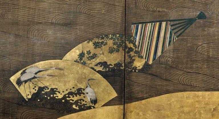 六屏屏风一对《江上浮扇》江户时代 纸本彩金