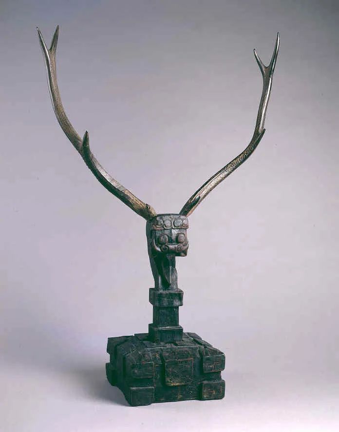 麂皮鼓架 战国 漆木和彩绘鹿角