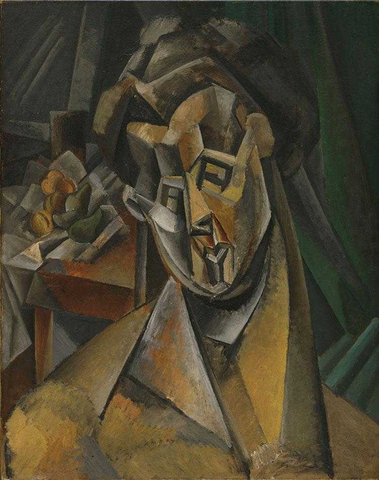 毕加索是塞尚从未见过的天才学生。你可以在最后看一下毕加索的《女子与梨(Woman with Pears)》,这是他创作于1909年的肖像画,描绘的对象是他的情人费尔南德·奥利维尔( Fernande Olivier)。这是一幅肖像画吗?费尔南德的头是巨大的、工业化的,就像现代主义纪念碑上紧绷的螺旋形大梁。而她的颈部肌腱在电光石火的曲线中激射而出,她的眼睛是令人震惊钻石钉,被安置在一个平面上,她的头发是一堆黑色的“羊角面包”。然而,在这个巨大的新时代的面具边,这些又完全是可识别的。桌上的简化梨,也是塞尚笔下的梨。你可以回到之前的展厅,通过与塞尚的作品《糖碗、梨和桌布(Sugar Bowl, Pears and Tablecloth)》中的水果进行比较、确认。