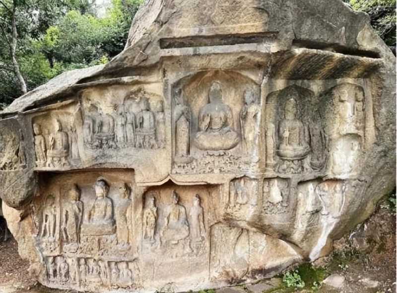 石窟大者高5m,小者5cm,均雕刻在一块高17m、东西长16m,南北宽15m的一块独立巨石四周,属摩崖石窟造像。