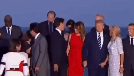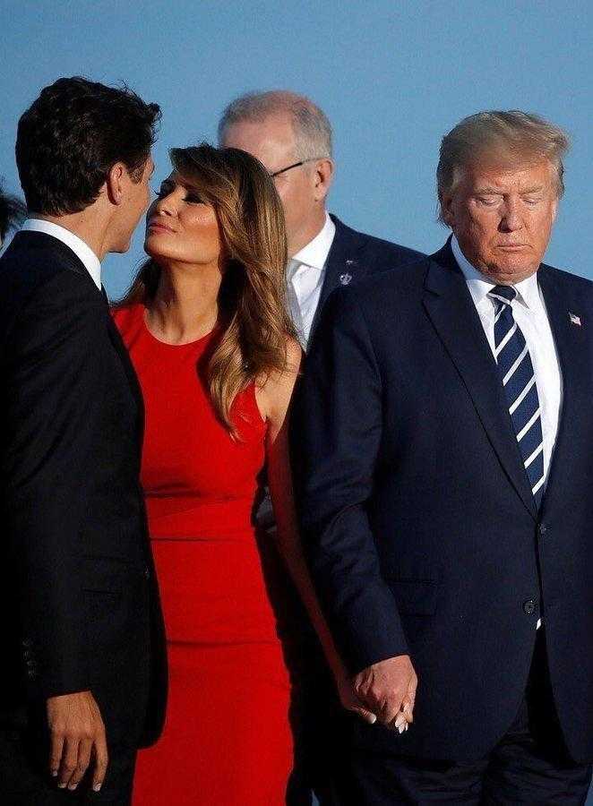 2019年,G7峰会上,身着红裙的梅拉妮娅几乎与伊万卡一样,竟然非常少女地被特鲁多所吸引,甚至当着特朗普的面噘起嘴向特鲁多“索吻”。