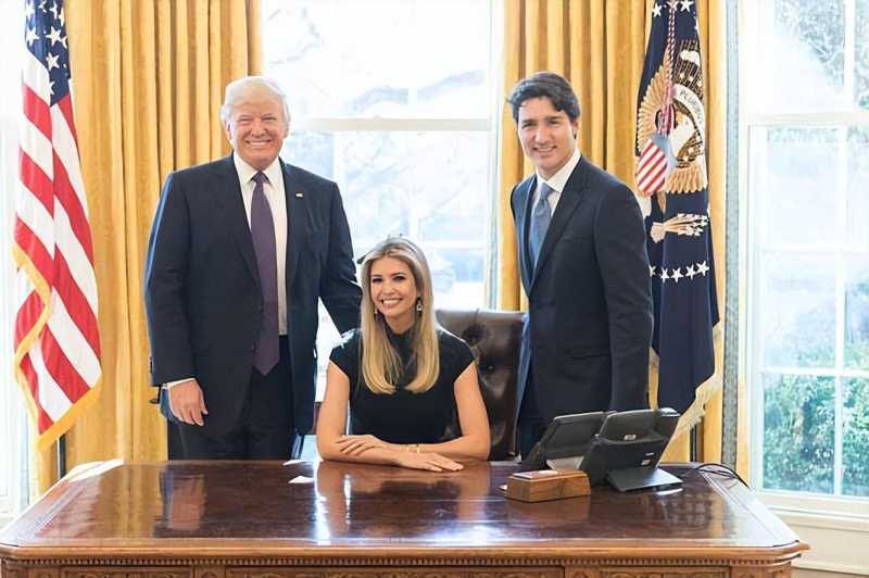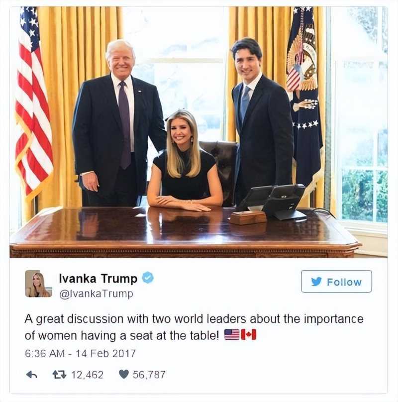 照片中正是伊万卡与父亲特朗普以及加拿大总理特鲁多,当时伊万卡就坐在白宫椭圆形的办公室中的办公桌前,而身侧分别站着特朗普与特鲁多。