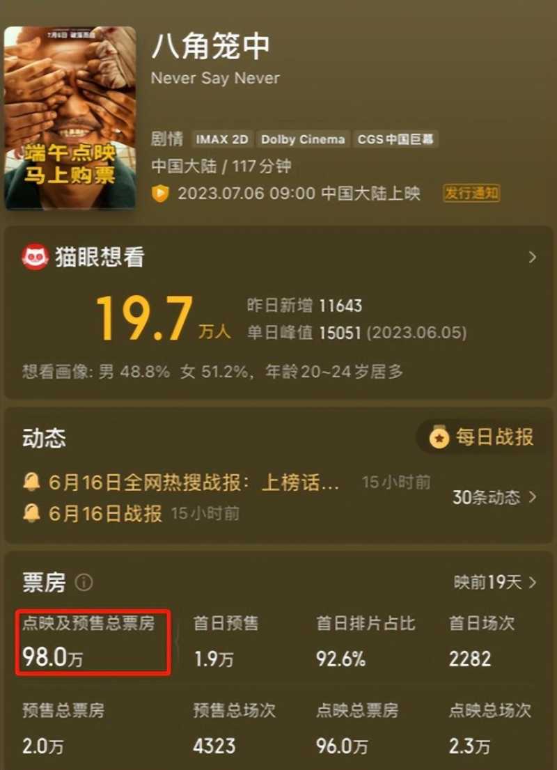 眼下《八角笼中》已经进入点映阶段,观影人数不少,截止目前收获点映以及预售票房98万。同时,首波口碑也新鲜出炉,现场观众的打分评价都“一针见血”。