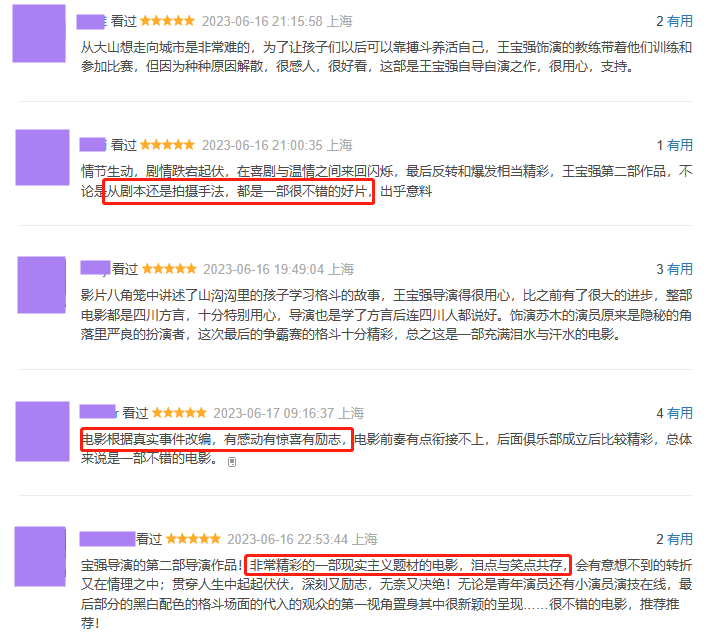 《八角笼中》的四星、五星好评众多,有网友称:“从剧本还是拍摄手法,都是一部很不错的好片”、“有感动有惊喜有励志”、“非常精彩的一部现实主义题材电影”。