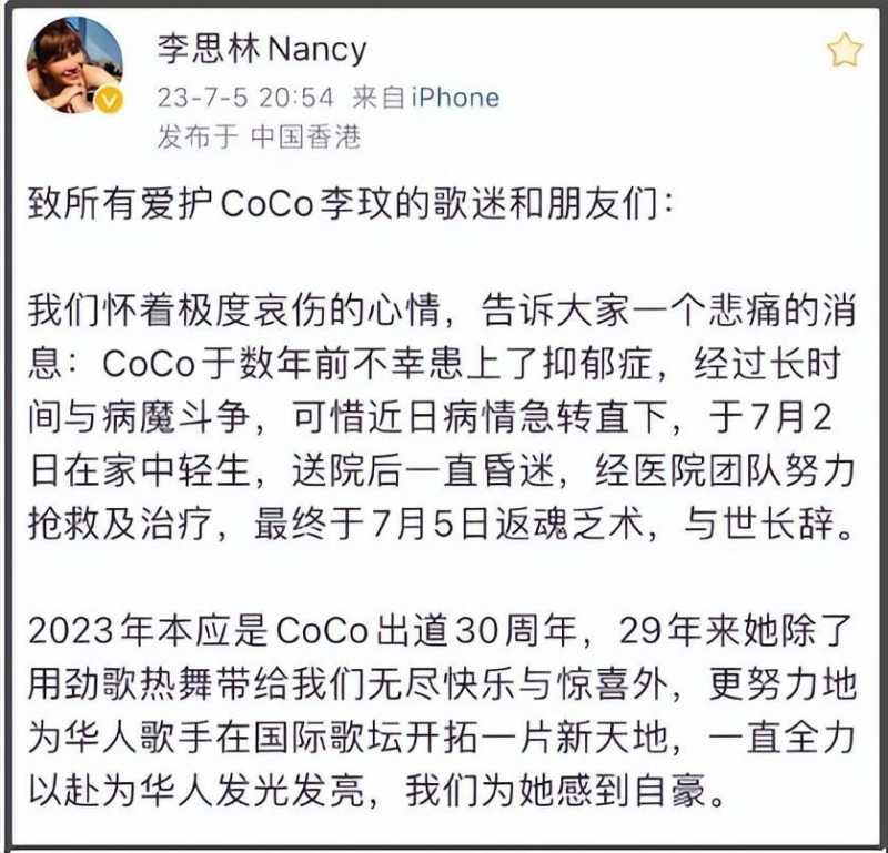 2023年7月5日,著名女歌手李玟的亲属,在社交媒体上发布了讣告。