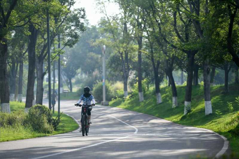 7月16日,市民在成都天府绿道骑行。新华社记者 胥冰洁 摄
