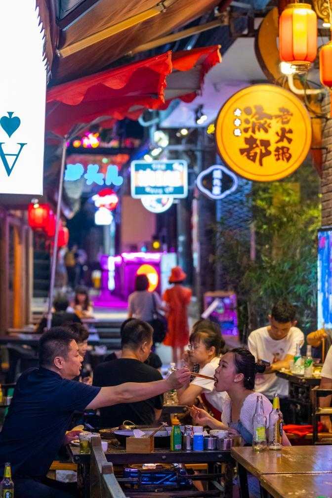 食客在成都猛追湾街道望平社区的美食一条街“香香巷”中吃火锅(2021年7月1日摄)。新华社记者 沈伯韩 摄