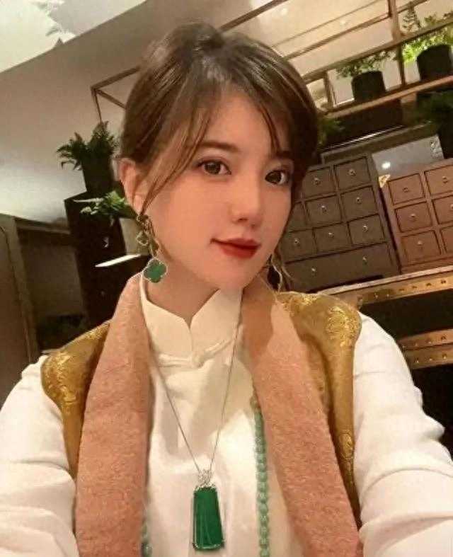 她参加《天天向上》节目时,穿着一身亮金色的民族服装,胸前挂着一大串看上去很普通的珠子。